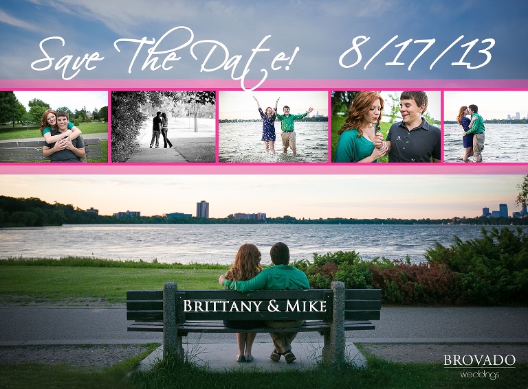 Lake of the Isles – or just simply “Isles”, as it is known to locals – is one of the prettiest lakes in Minneapolis. That’s probably the reason Brittany and Mike chose to have their engagement photos taken there. We had a lovely stroll around the lake, stopping from time to time to take some pictures on a bridge, or a park bench, or in a boat, or in the water! We had such a great time, and I am so blessed to be shooting this couple’s wedding. They really love each other and know how to laugh together. Thanks for a wonderful day, Brittany & Mike! Oh, one more thing…. As I do after most engagement photo sessions, I designed a Save the Date card for Brittany and Mike to send out to their guests. Take a look!