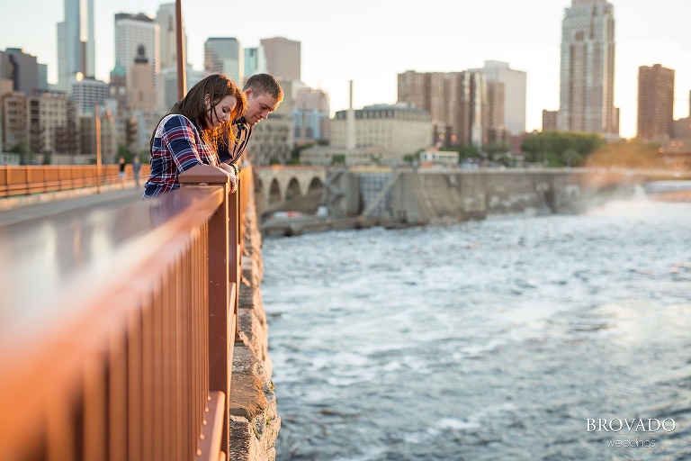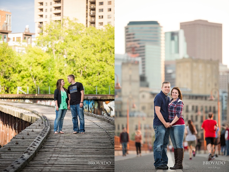 I took these lovebirds over to Father Hennepin Park to shoot some engagement photos around the Stone Arch Bridge. The light was perfect. It was a little overcast, as Minneapolis has decidedly been for most of the summer, but that’s actually preferable for outdoor photography. Kamaria and Chris’ love for hiking and the outdoors was apparent as we tromped through the various landscapes the St. Anthony Main area has to offer. Parks, woods, railroad bridges, narrow urban alleys, downtown skyline backdrops… They had fun every step of the way, and I loved getting to know them. Even after so many years together, these two are still so in love, and it’s so totally obvious.